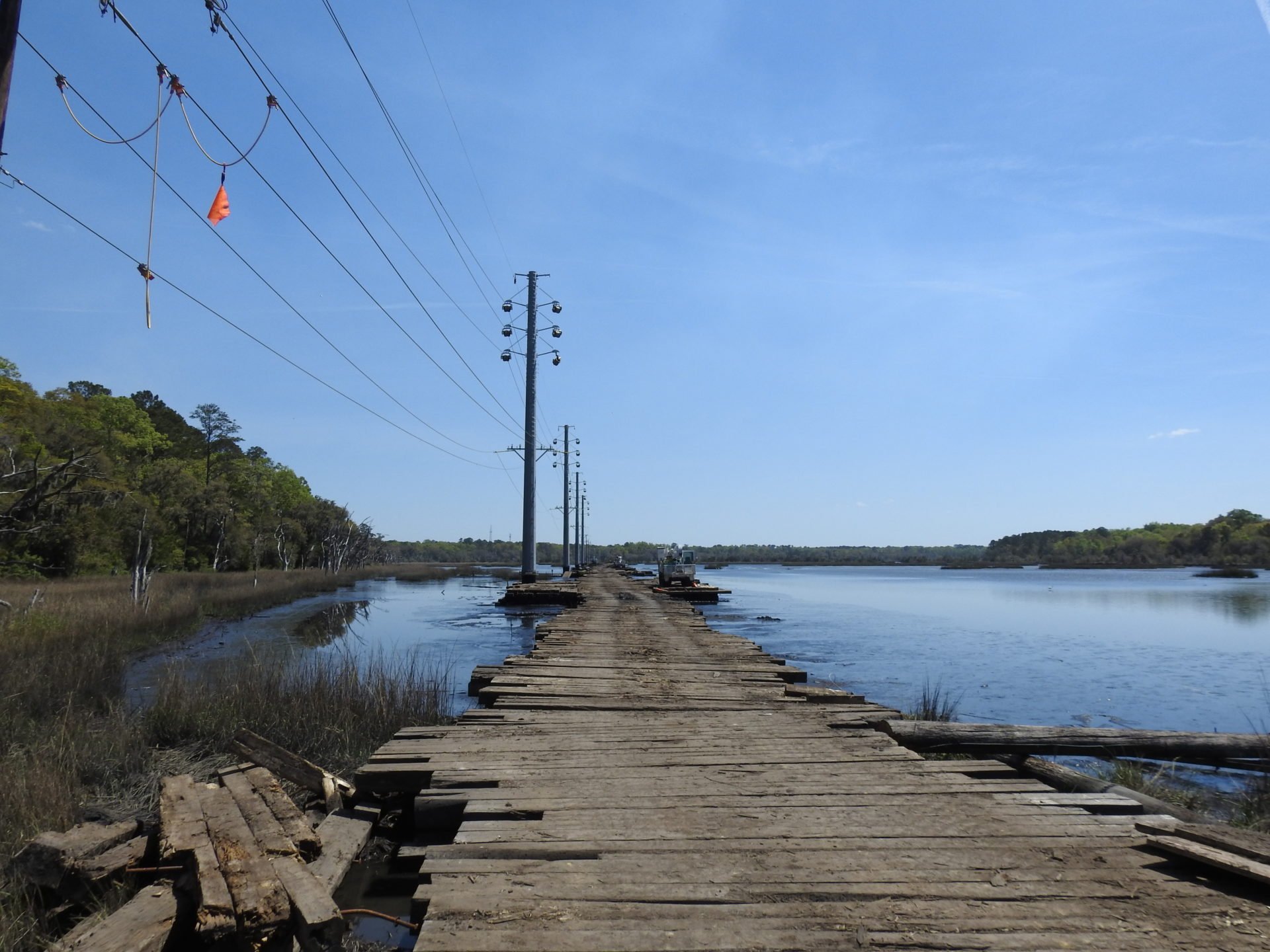 Two dedicated Sumter crews performed time and materials (T&M) work to implement several critical upgrades. The scope included replacing outdated bell insulators with modern polymer alternatives, installing new through bolts to enhance structural integrity, and adding reflective strips essential for safety in navigable waterways. The team also reinforced existing infrastructure by installing new down guy wires and guy plate attachments for brace poles. Additionally, crews installed steel bands to secure concrete poles to their concrete pier foundations, ensuring long-term stability in the challenging waterway environment.