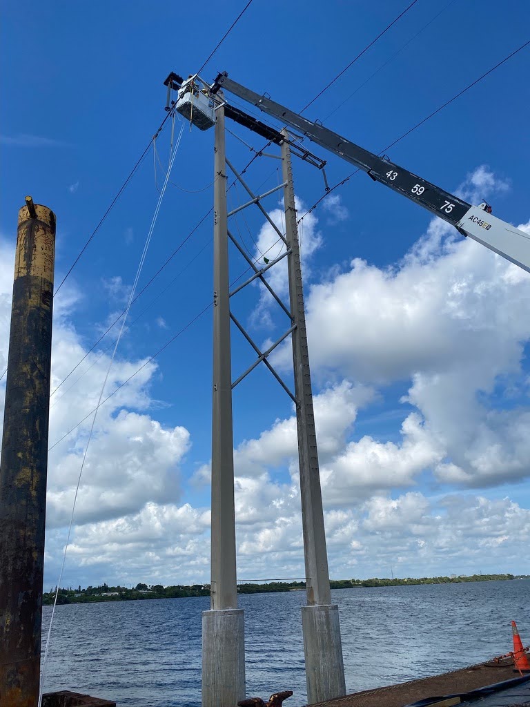 Sumter Utilities served as a subcontractor for Irby Construction on this emergency repair project along the Indian River Waterway in Melbourne, Florida. The project involved specialized barge-based operations to access and upgrade 17 transmission structure locations on a line originally constructed in 1983.